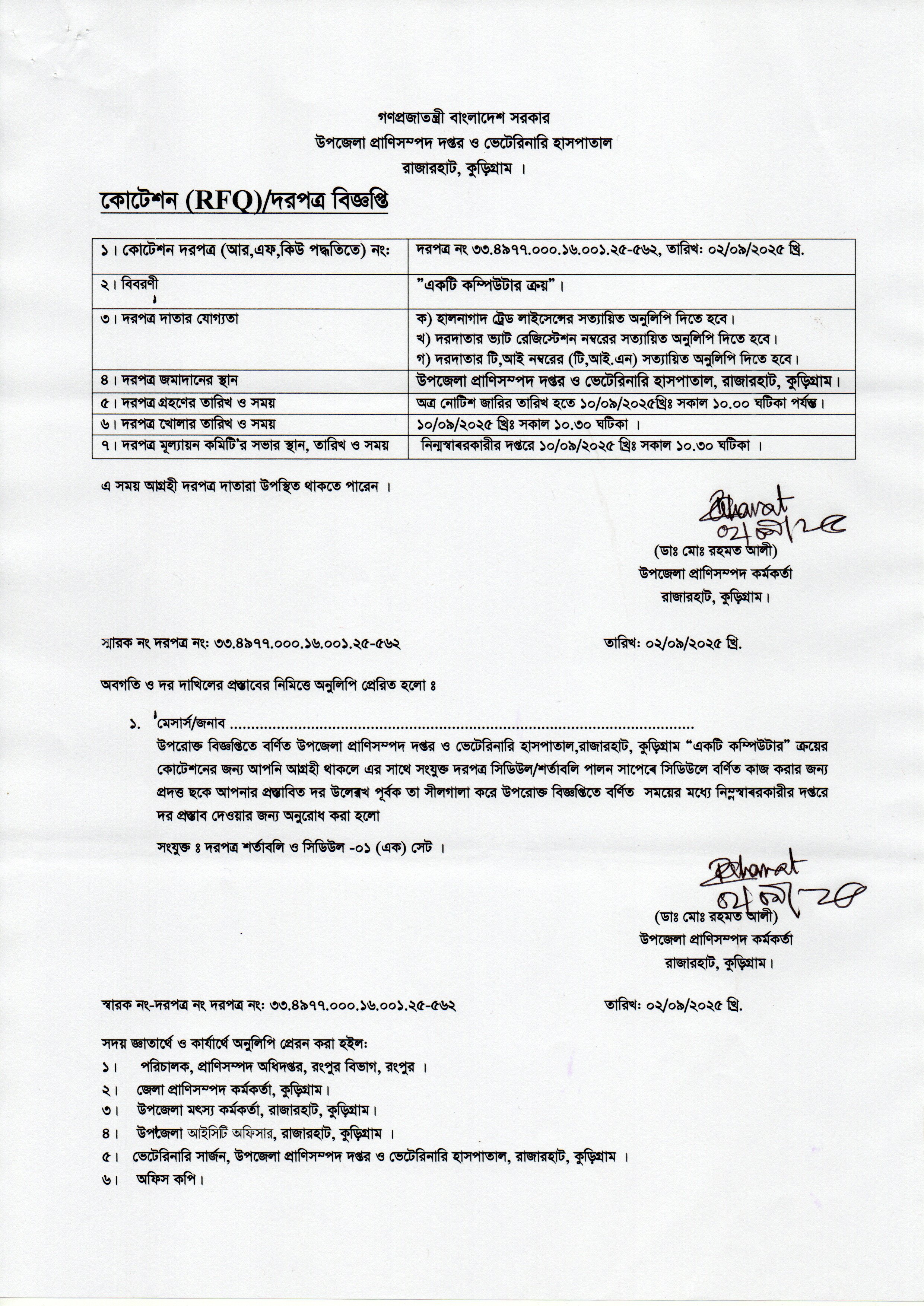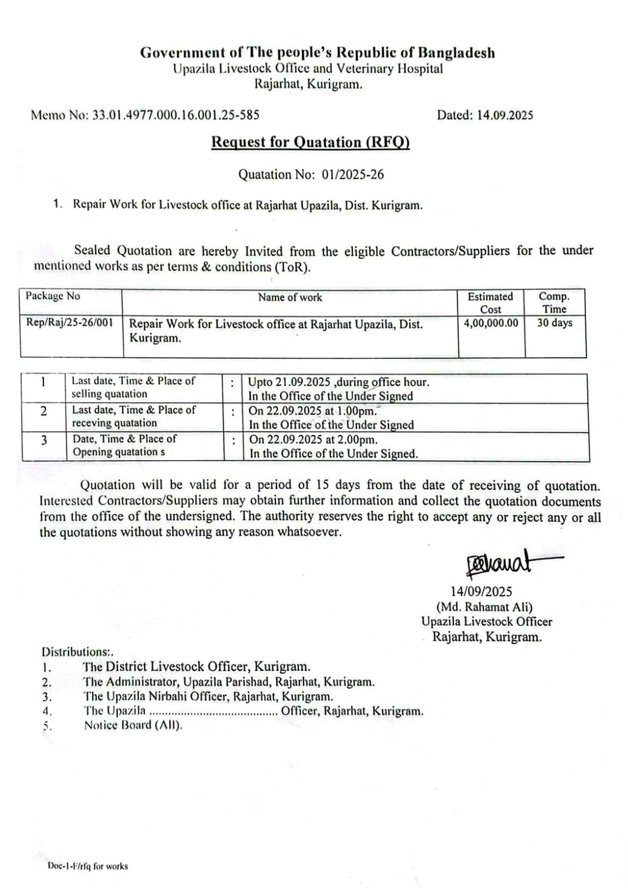 | ৭ | RFQ-Repair work for Livestock office at Rajarhat, Kurigram | | | ১৪-০৯-২০২৫ | দেখুন |